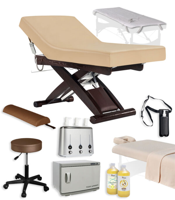 | Accessoires | 1 tabouret à roulette, 1 alèse chauffante, 1 appareil chauffe serviette stérilisateur, 3 ensembles de draps (3 pièces) en flanelle, 1 appareil chauffe huile de massage avec 3 bouteilles, 1 holster porte-bouteille d’huile avec son flacon pompe, 1L d’huile de massage neutre (PRO-2), 1L d’huile de massage naturelle (Noix de coco), 1 bolster demi lune (modèle moyen). |